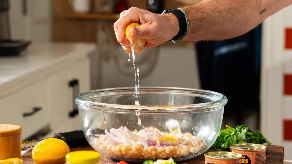 Between the lemon juice, zest, red wine vinegar, olive oil, salt, and black pepper, every ingredient has a job. The acidity lifts the tuna and beans.